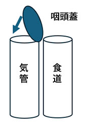 頸部の前に気管があり、後ろに食道が通っている。誤嚥を防ぐためにフタ(喉頭蓋イントウガイ)が閉まるようになっている。生まれつきフタが閉まりにくい人もいる。水を飲みながらしゃべったりすると、気管に水が入りかけて真っ赤になるまで咳き込んでしまう。フタの閉まり具合は人によって異なる。