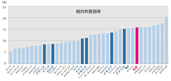 日本は世界的にみても大変貧しい国だ。相対的貧困率を見ると日本より貧しい国は東欧諸国などわずかな国しかない。