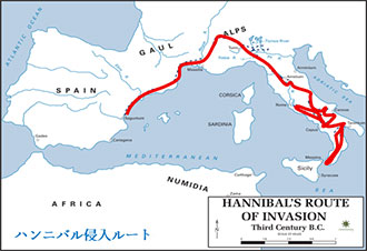 紀元前218年、ハンニバルはカルタゴを出発。軍勢にはカルタゴの伝統に従い多数の傭兵が含まれ、歩兵9万人にリビア兵6万とヒスパニア兵3万、騎兵1万2千はヌミディア兵主体で、戦象(戦争に使う象)37頭を率いていた。